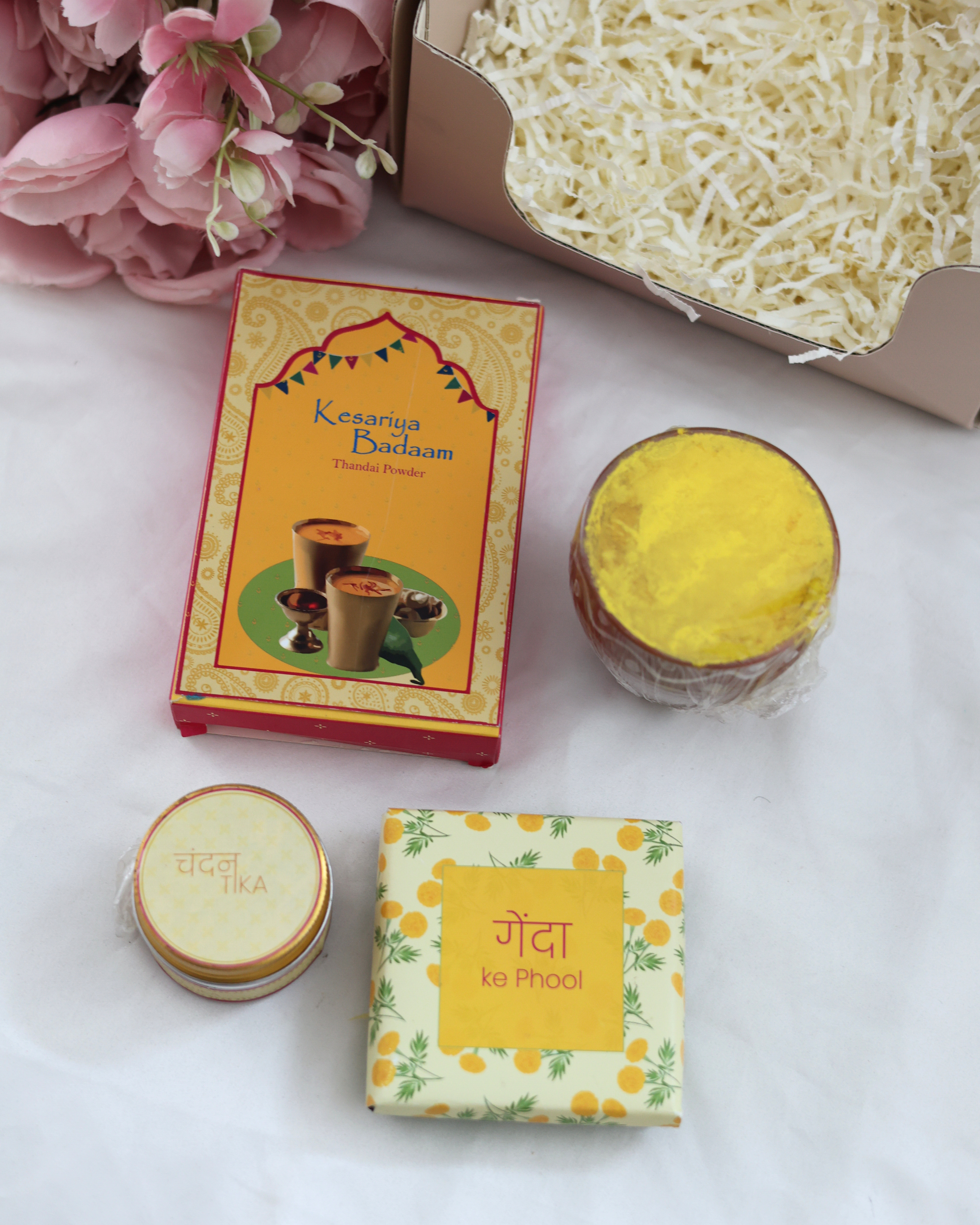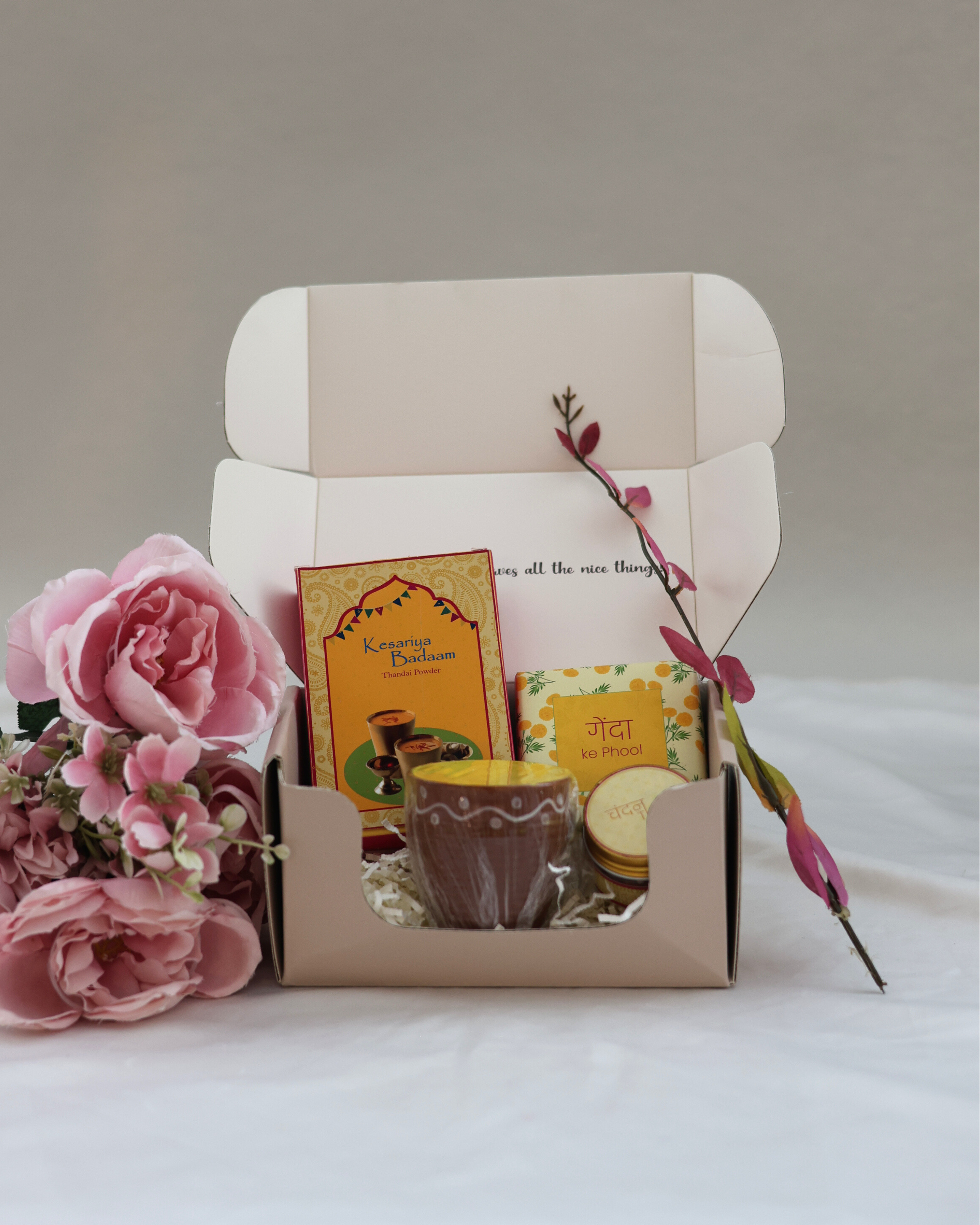 Celebrate Holi with royal elegance through this festive hamper featuring rich badaam thandai, faux genda flowers, a handcrafted yellow kulhad, and fragrant chandan tika all beautifully packed in TKC’s All Things Nice box. A perfect fusion of tradition, color, and regal charm.