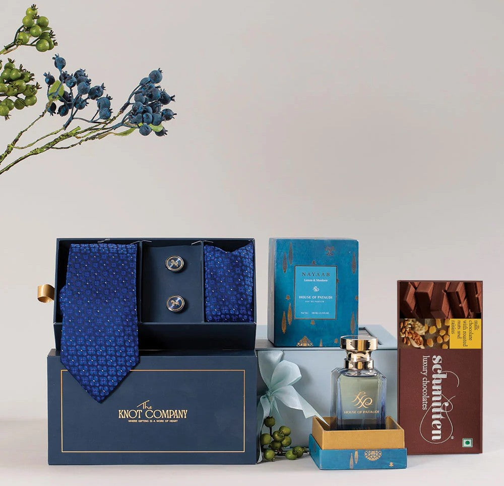 A refined selection of accessories for the modern gentleman, this gift box is a statement of sophistication. It includes a Blue Textured Tie, Blue Textured Pocket Square, and Navy Blue & Silver Finish Cuff Links, ensuring a polished look for any occasion. Packed elegantly in The Knot Company Elite Box, this set is the perfect gift for someone who appreciates timeless style and fine details.