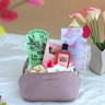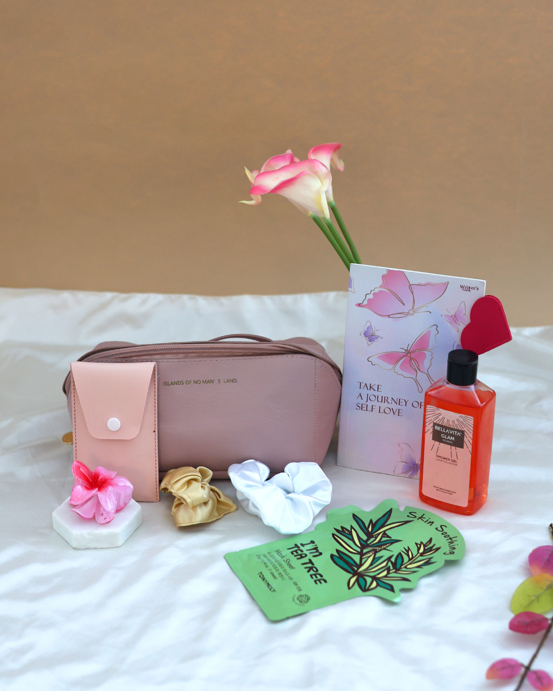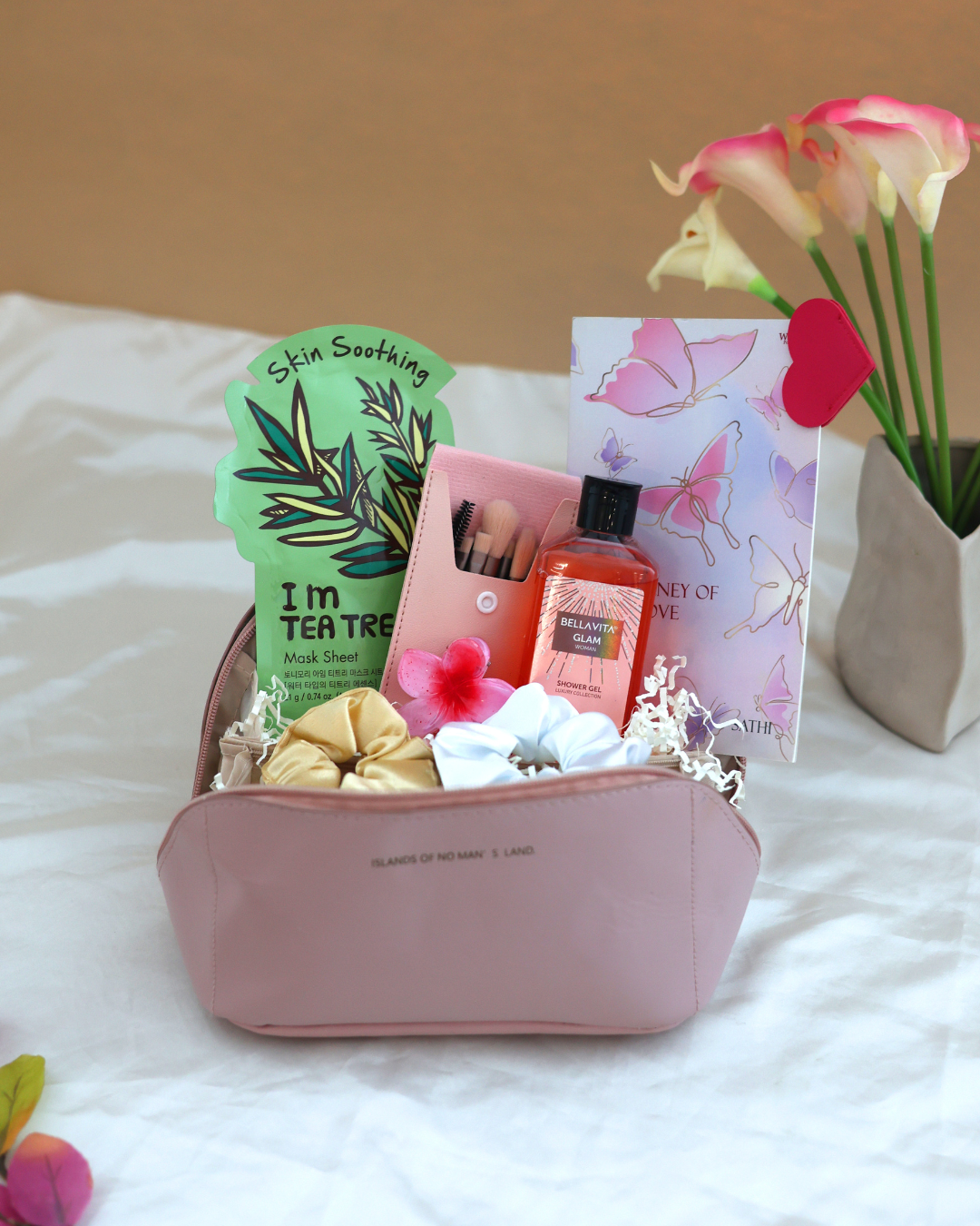 A self-care essential for beauty lovers featuring a Tony Moly tea tree sheet mask, 8-piece makeup brush set, Journey of Self Love book with a heart bookmark, stylish scrunchies, Bellavista shower gel, tropical claw clip, and a chic cosmetic bag. A perfect gift to glow, pamper, and feel beautiful.