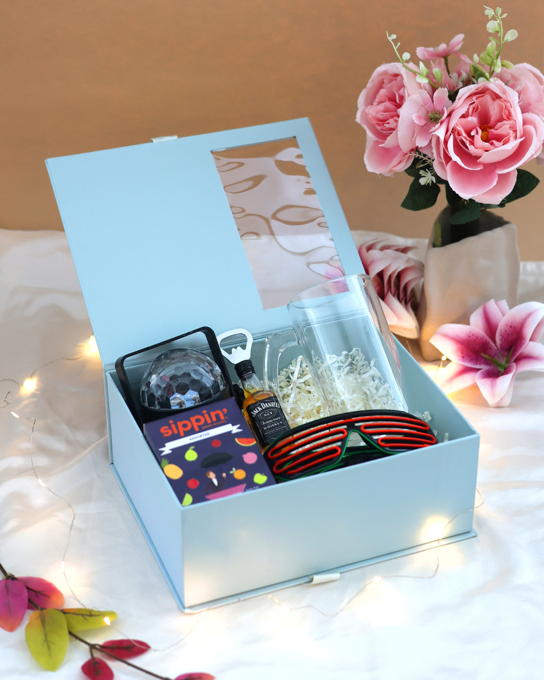 Turn the night into a celebration with this fun party-ready hamper featuring LED party lights, a Sippin drink mixer, Jack Daniel’s bottle opener, glass beer mug, and cool LED sunglasses - all packed in the stylish Peek-A-Boo box. Perfect for couples who love fun, music, and good vibes.