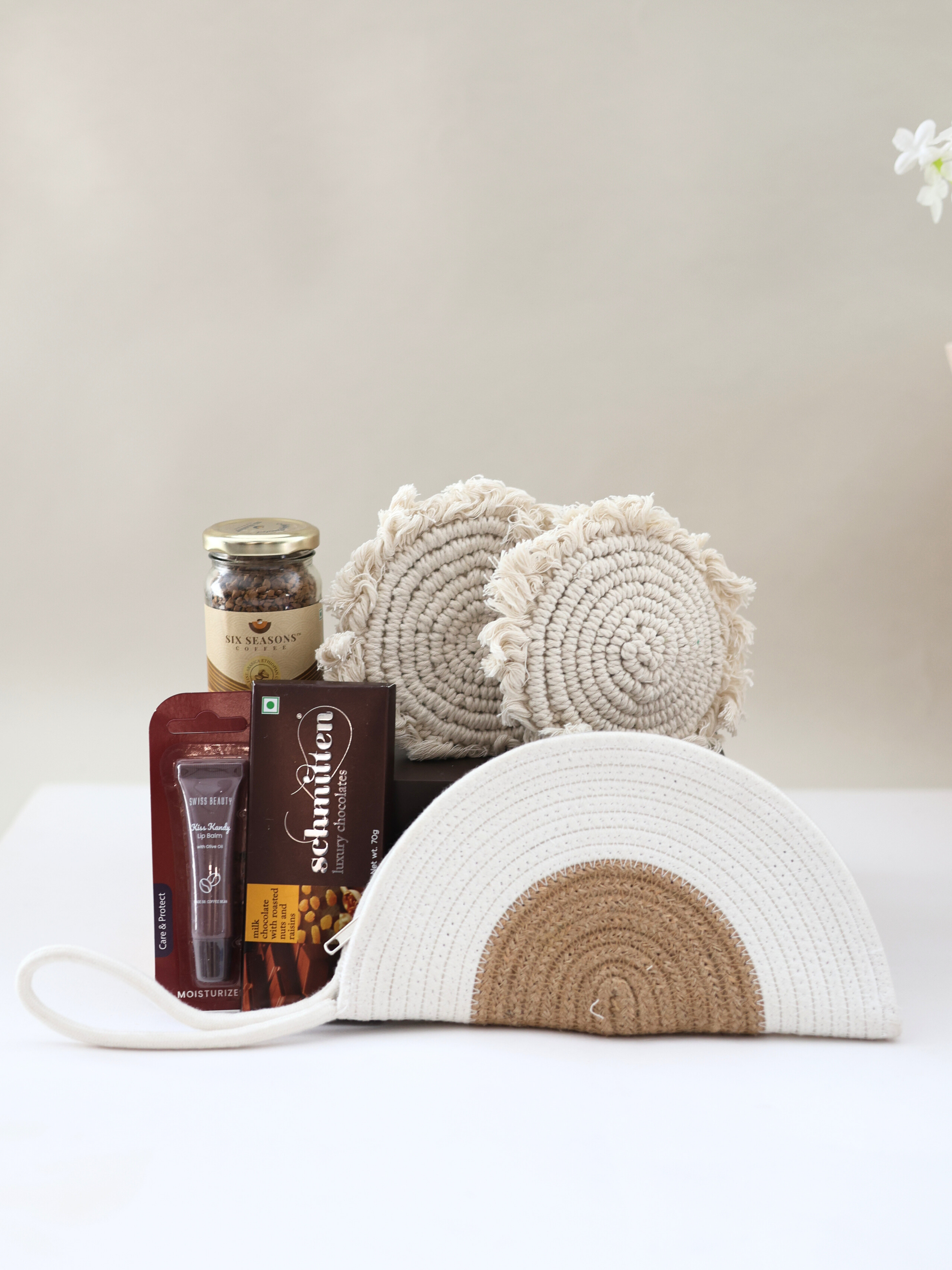 Embrace boho vibes with the curated collection of macramé coasters, a chic braided purse, pastel earrings, schmitten luxury chocolates, and many more enchanting delights - a perfect gift for the free-spirited soul.