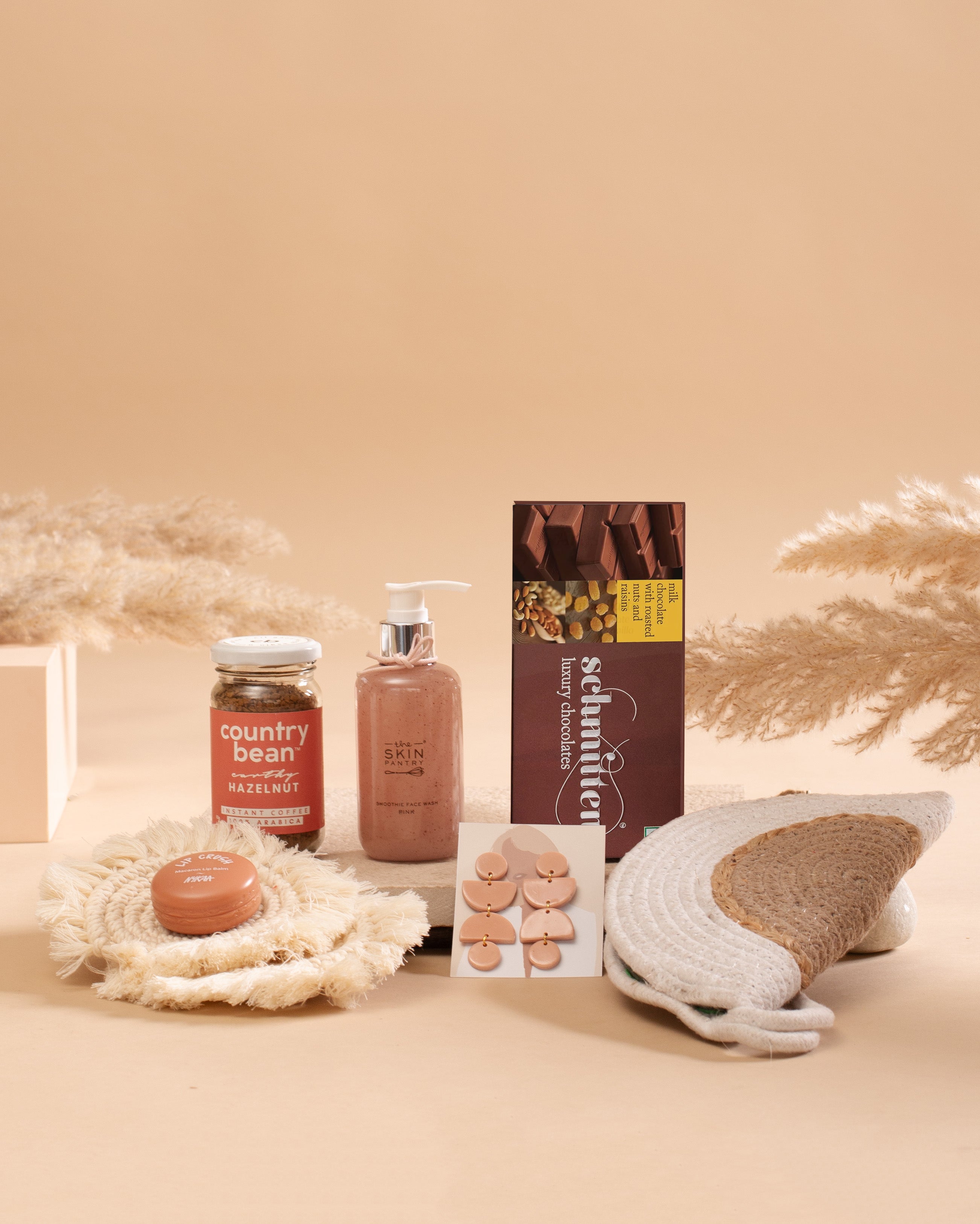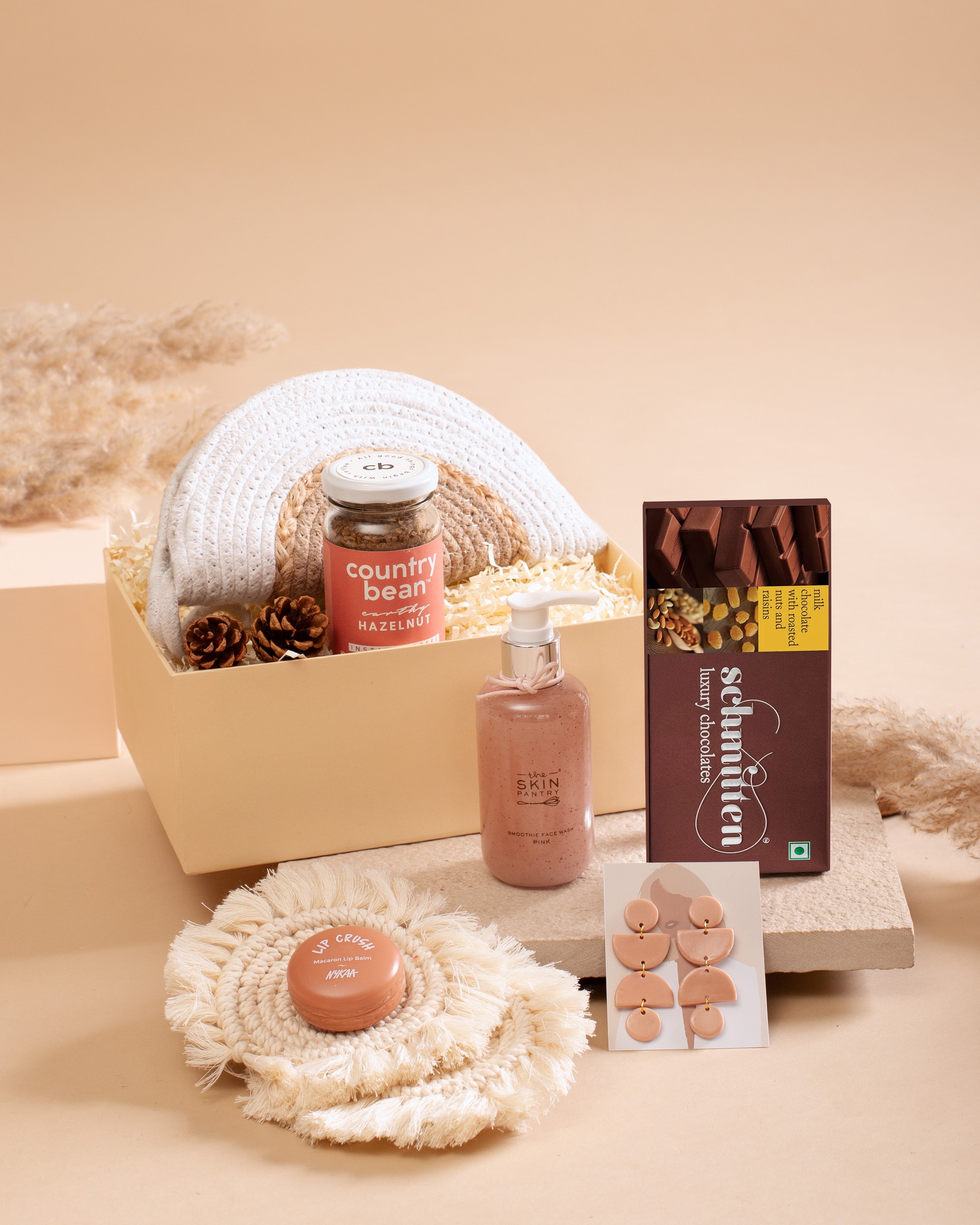 Embrace boho vibes with the curated collection of macramé coasters, a chic braided purse, pastel earrings, schmitten luxury chocolates, and many more enchanting delights - a perfect gift for the free-spirited soul.