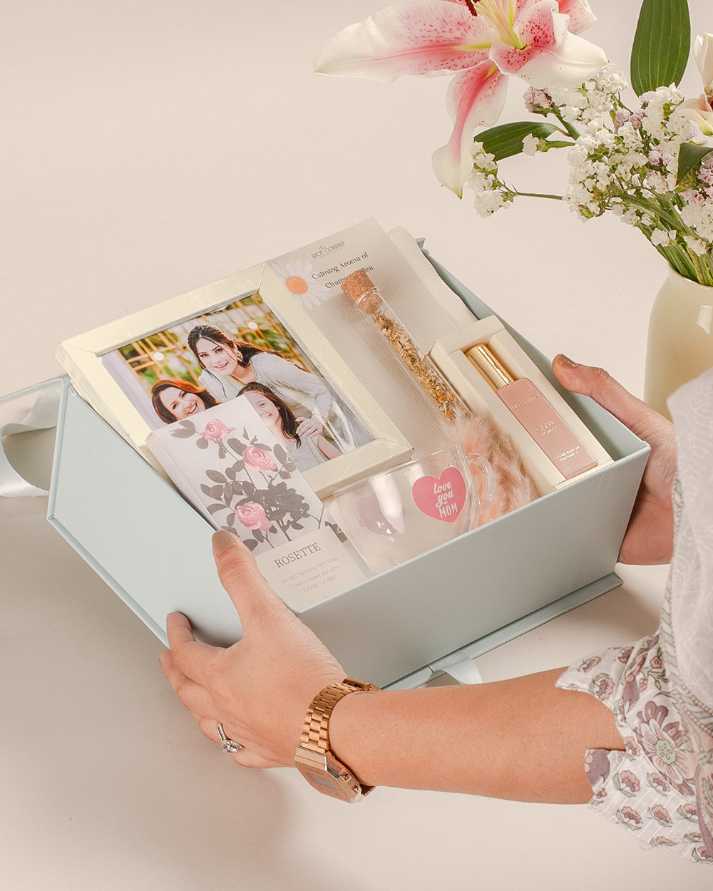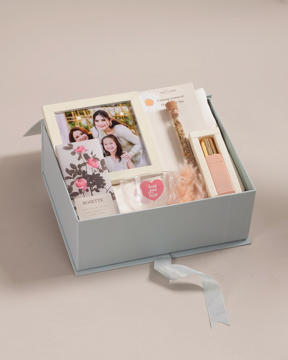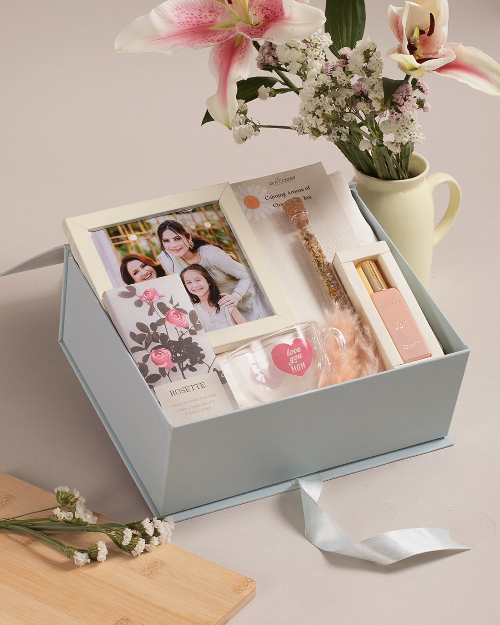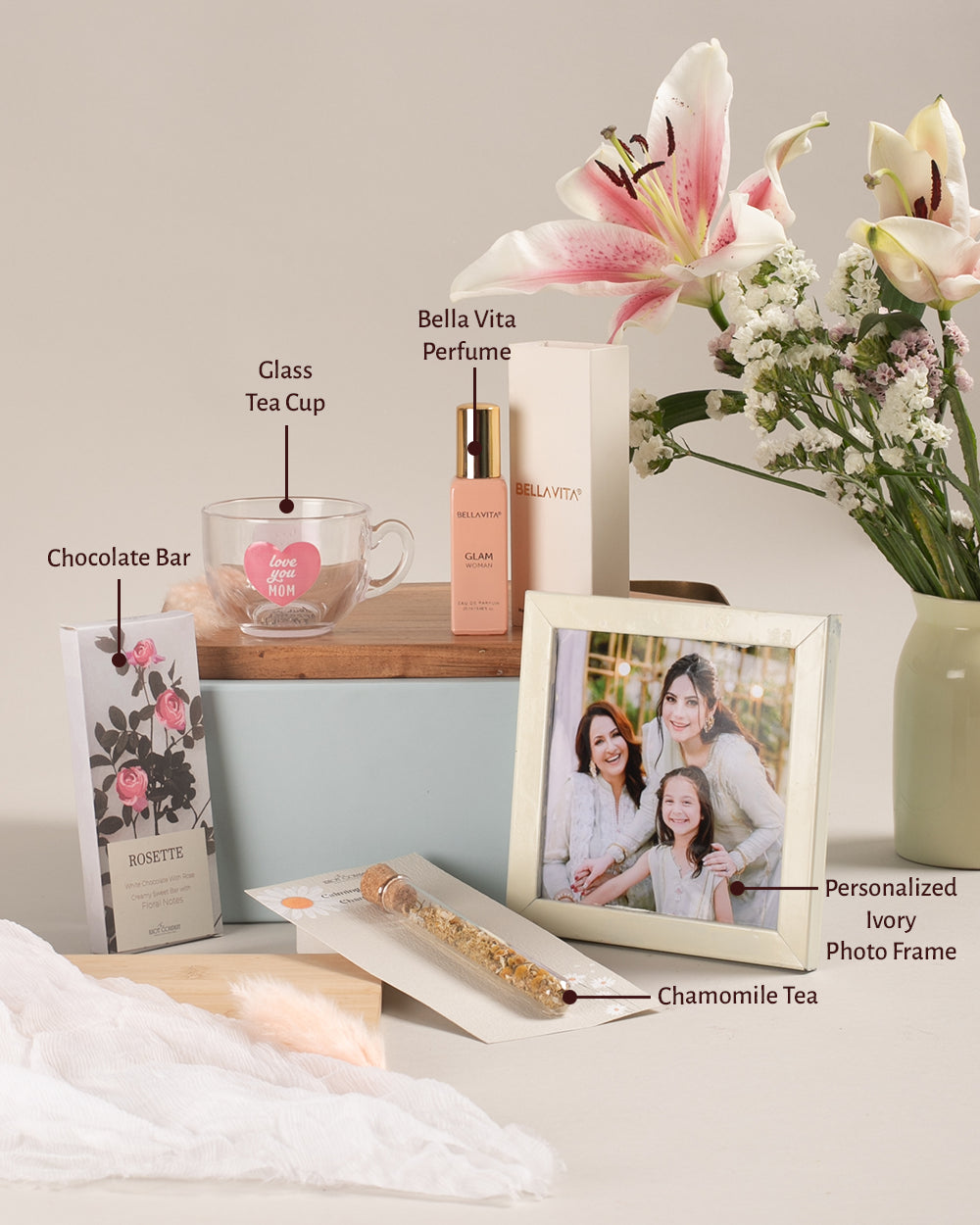 Make her feel as special as she truly is with a little something that speaks of nothing but love for her. This carefully curated gift brings together sweet treats, calming tea, a touch of elegance with a signature fragrance, and a personalized keepsake to hold cherished memories. Thoughtfully packed with love, it’s a beautiful way to remind her just how much she means to you.