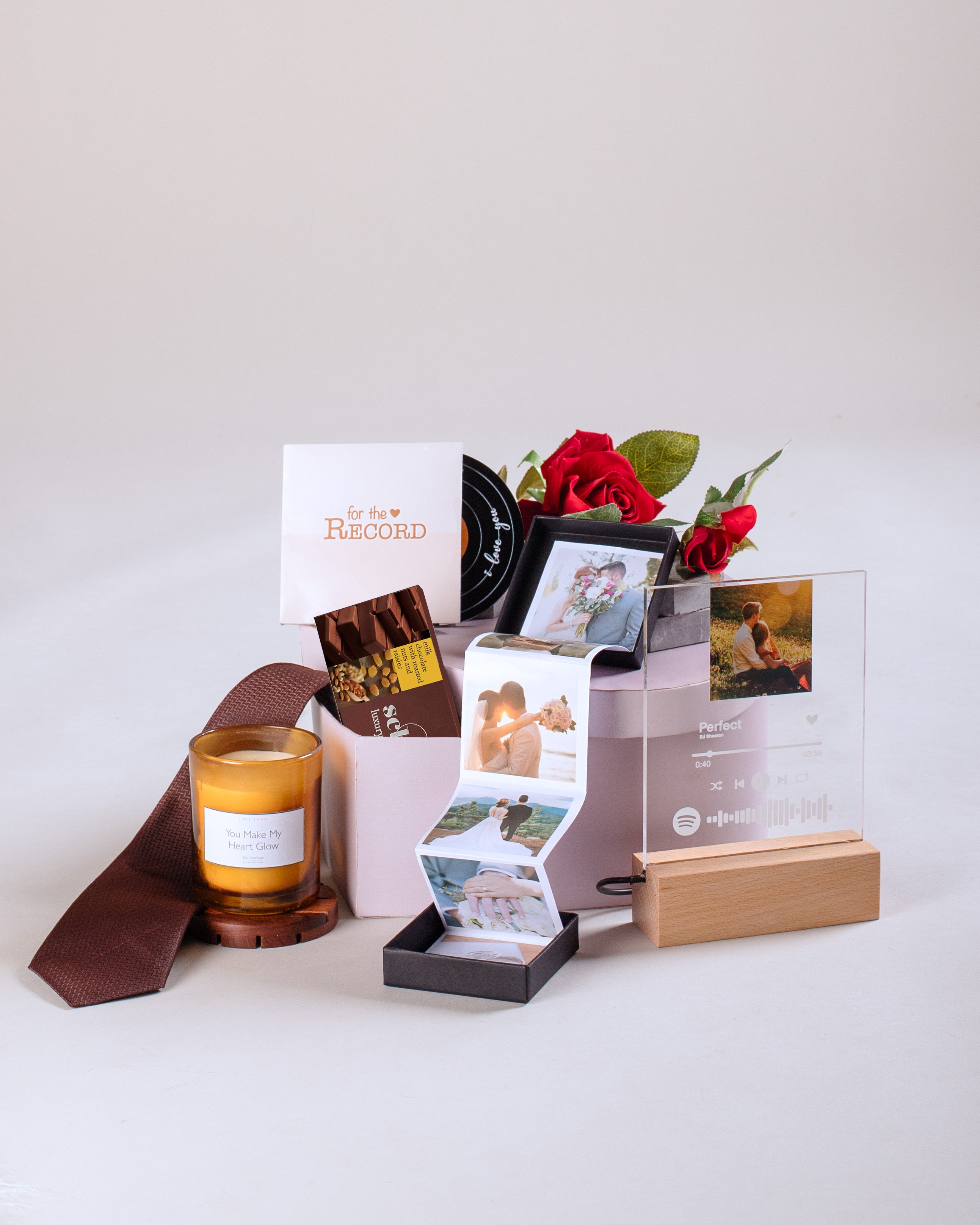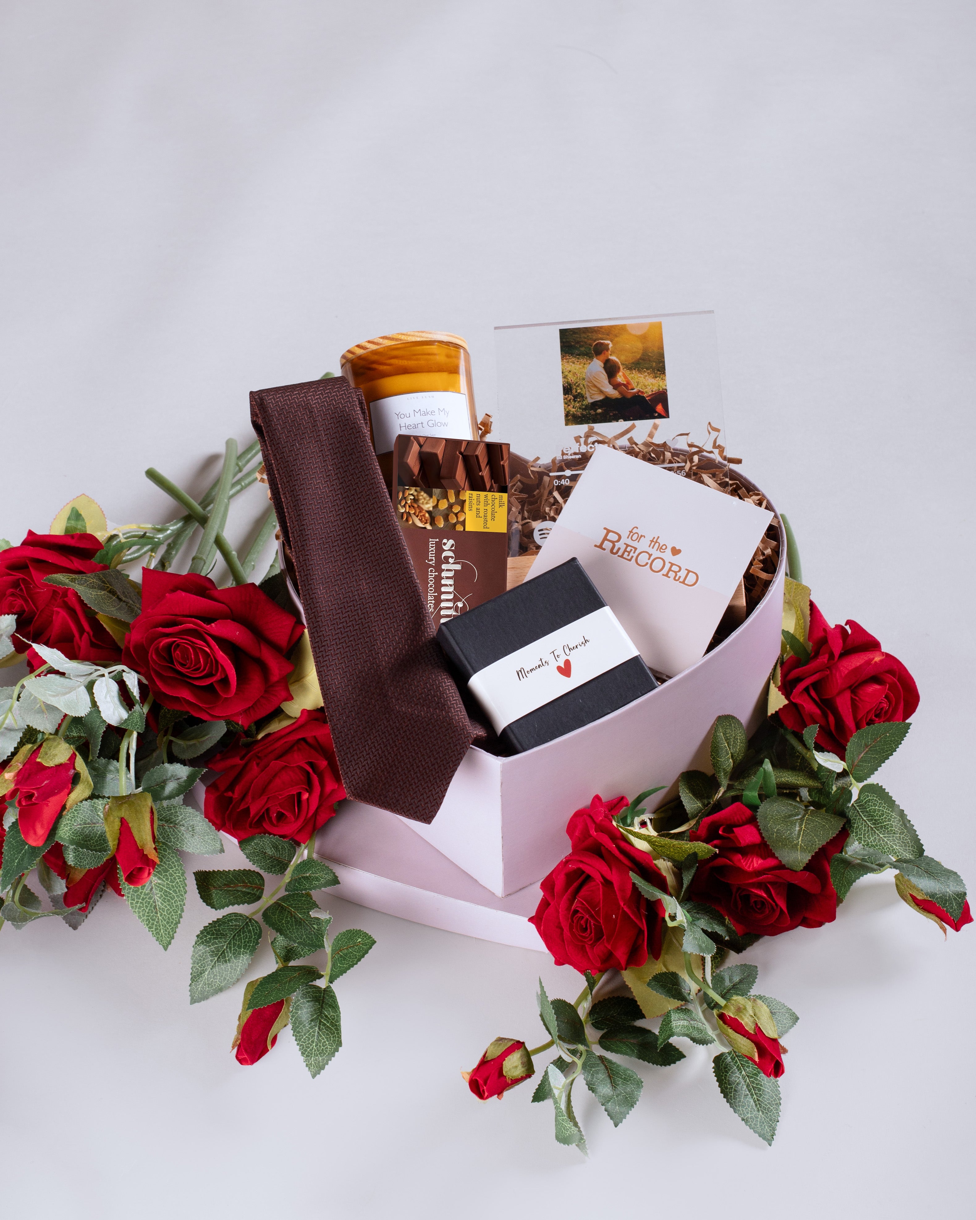 Embark on an adventure of 'Six Sensations of Love,' as each carefully chosen item embodies a unique facet of love. From the touch of a tie to the melodies on Spotify, a forever reminder with record coasters, visions in a photo roll box, and the sweet taste of a schmitten luxury dark chocolate each, is a heartfelt surprise for your special man.